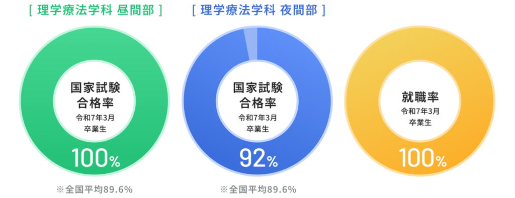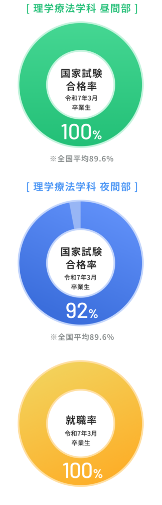 令和7年3月卒業生の国家試験合格率は昼間部100%、夜間部97%と、毎年全国トップレベルの合格率です。平成12年に開学して以来、多くの卒業生を輩出してきたノウハウと、学生一人ひとりをきめ細やかにフォローする体制で確かな実力が身につきます。